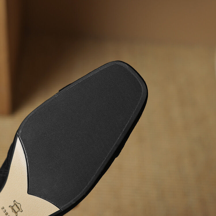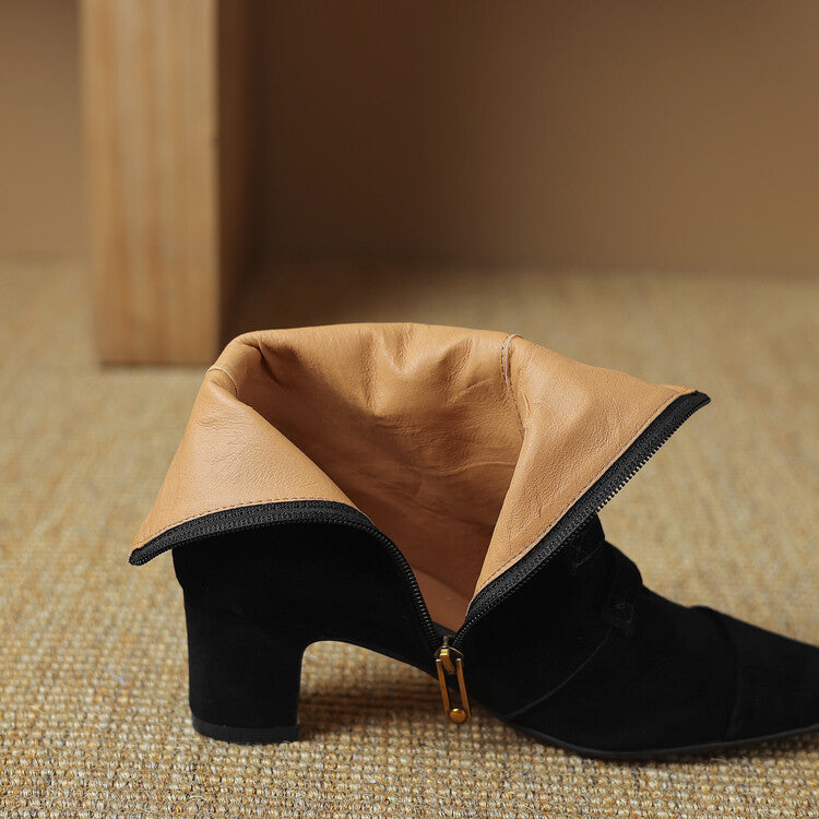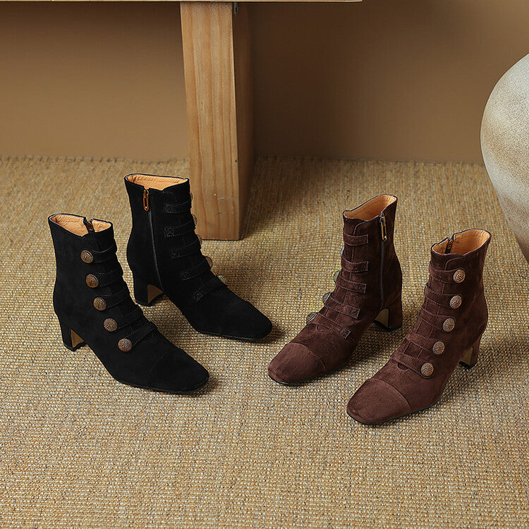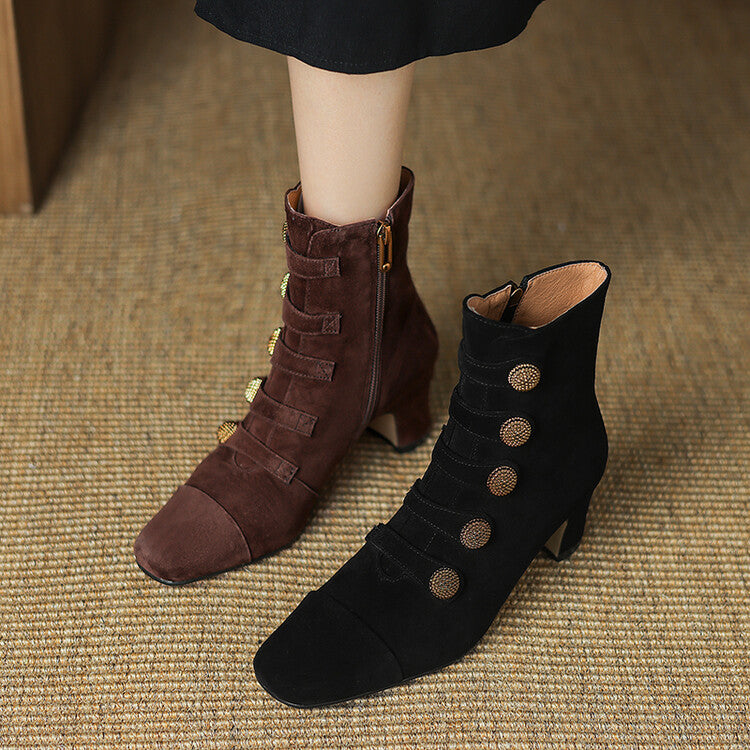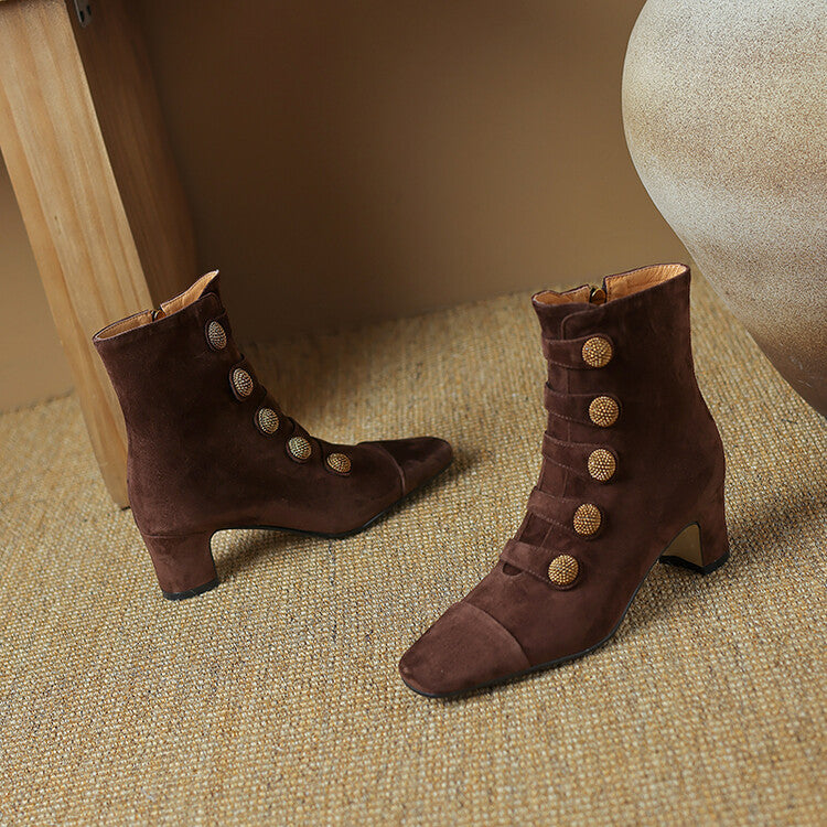 Made from soft sheep suede, these short boots are designed for durability and comfort during the colder months. A square toe and chunky heel add modern structure, while the zipper and button detail give a refined finish.