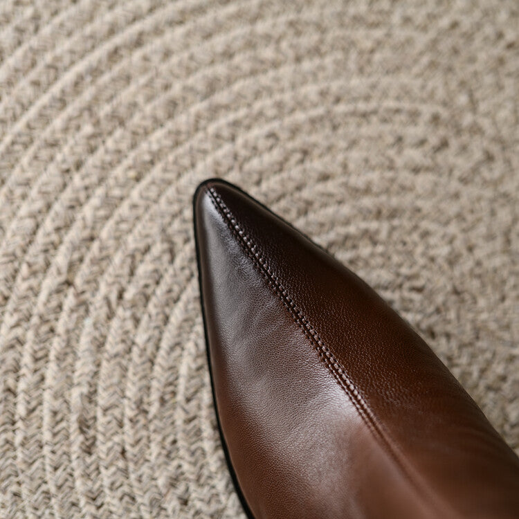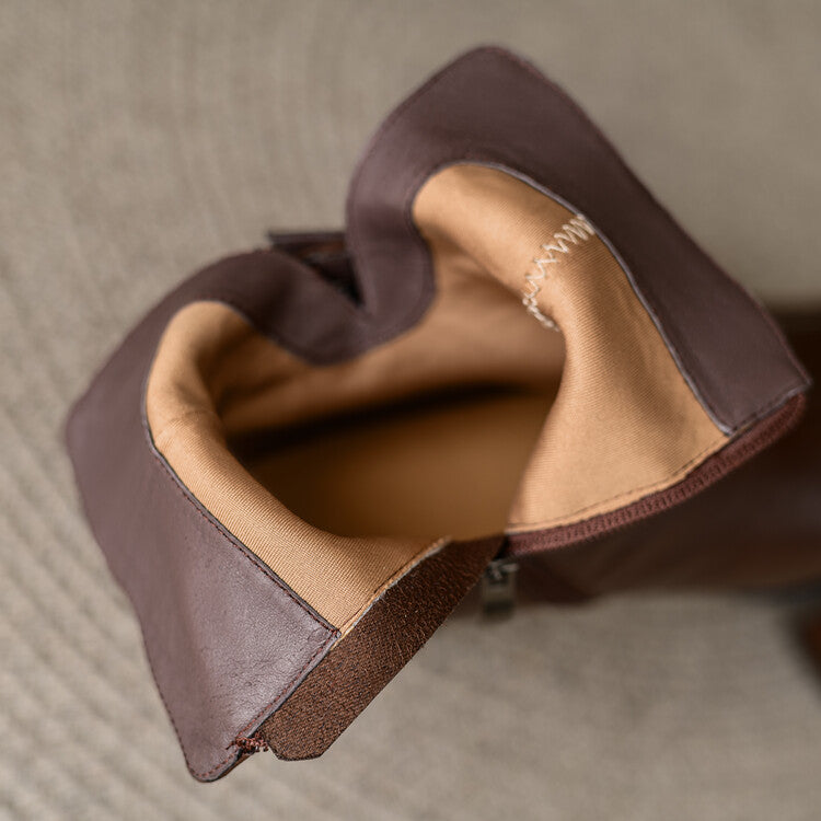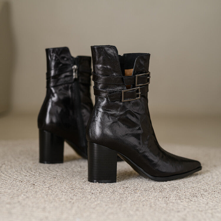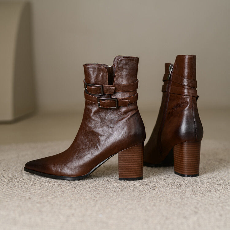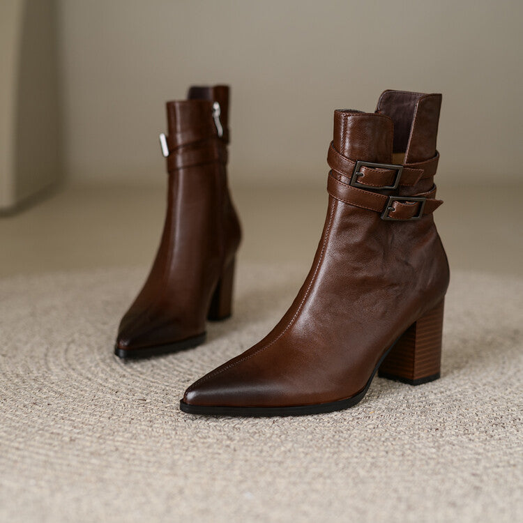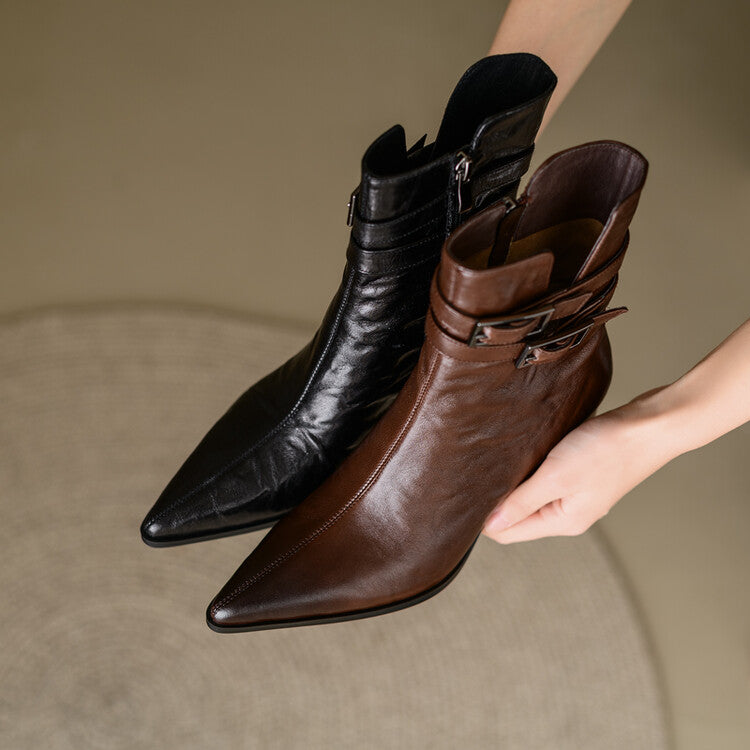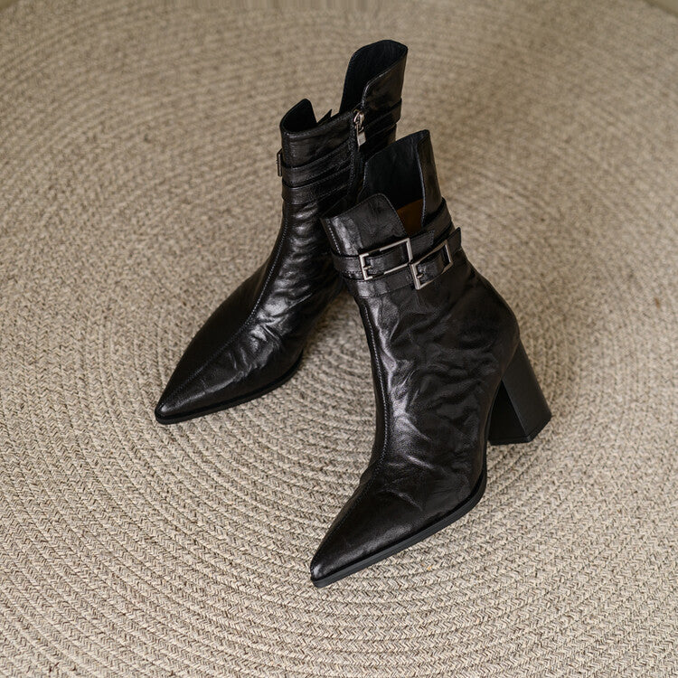 Crafted from premium split leather, these short boots are built for durability and seasonal style. A pointed toe and bold buckle detail bring a modern edge to autumn and winter looks.